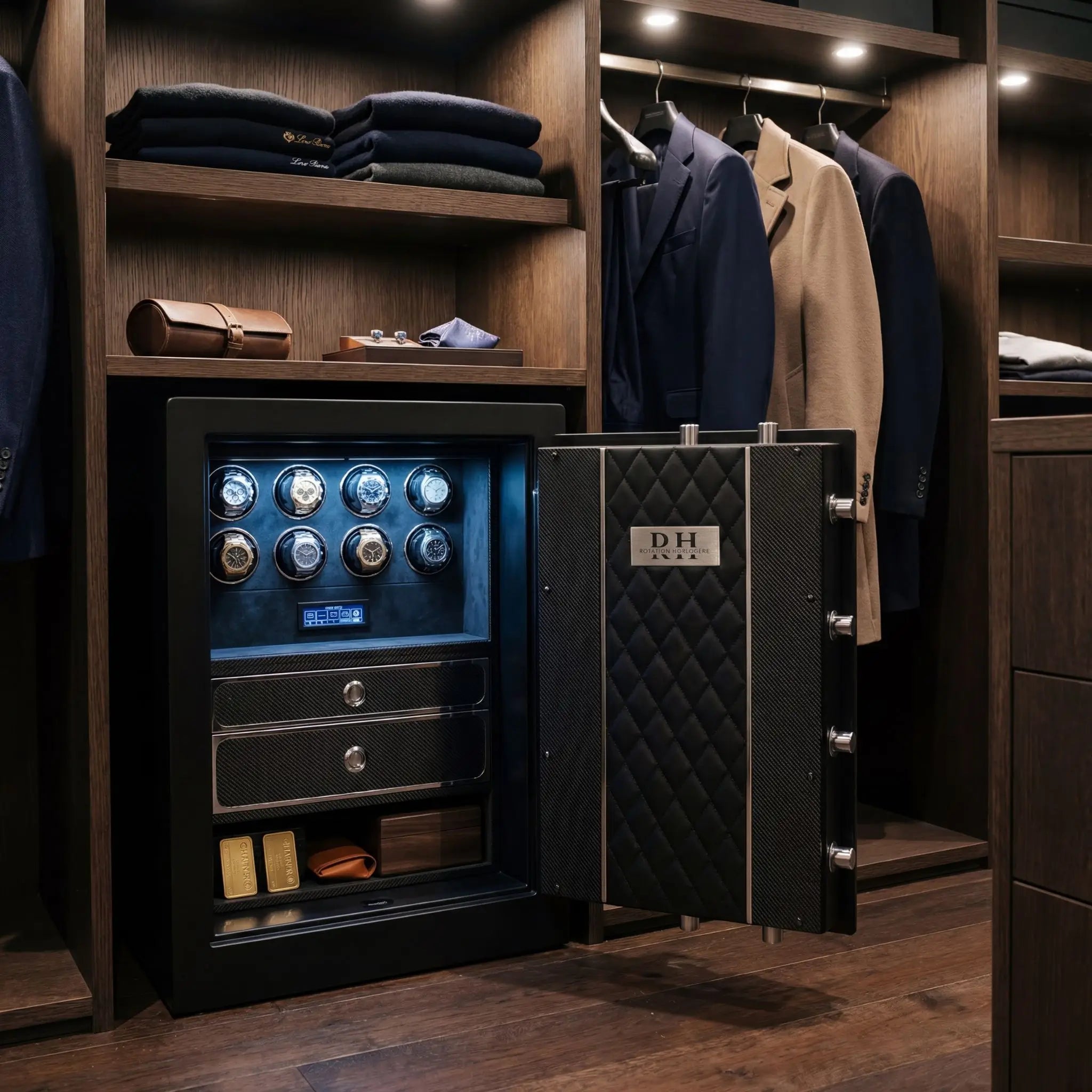 Seguridad y estética finalmente reconciliadas. Esta discreta caja fuerte guarda sus relojes más preciados, en constante movimiento, fuera de la vista. Excelencia, incluso en silencio.